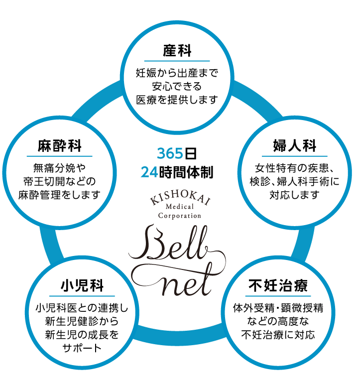 経験豊富な常勤医師とベルネット各クリニックとの連携により、常に産婦人科医師が2名365日24時間管理する体制を構築しています。分娩はもちろん、緊急時の診療時間外診察にも対応。高いレベルの医療サービスをご提供します。